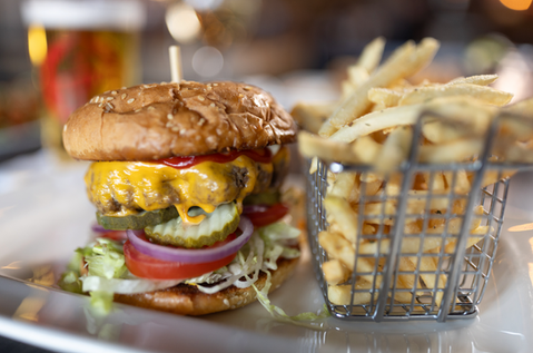 Our classic burger blend, sesame bun, American cheese, shaved lettuce, tomato, pickles, red onions, ketchup, mustard, mayo.